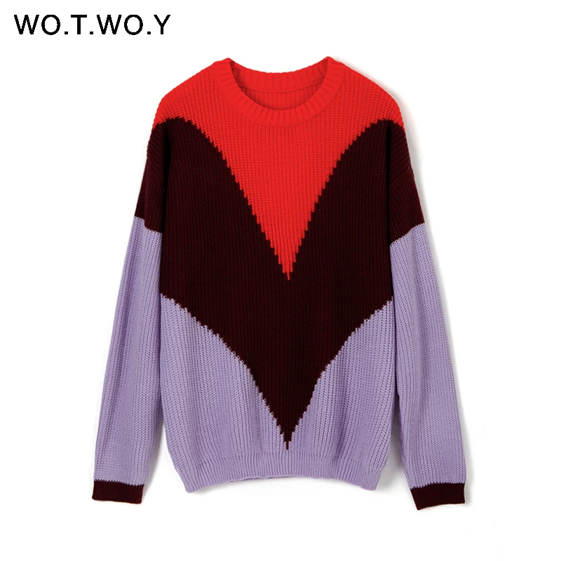 Special Offer WOTWOY nowa jesienna zima kontrastowe kolory Patchwork damski sweter swetry na co dzień kobiety O Neck dzianinowy z golfem Pull Femme Discount 40% Today!