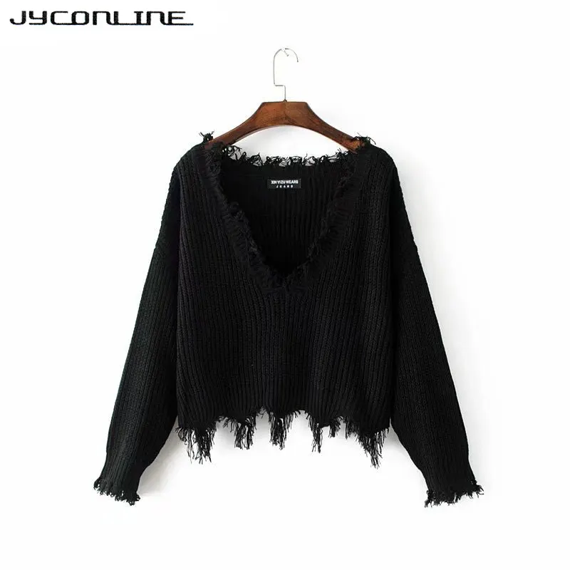 Product Name: JYConline seksowna dzianina sweter damski sweter czarny biały dekolt w serek zgrywanie sweter sweter Pull Femme nadwymiarowy sweter top z dzianiny