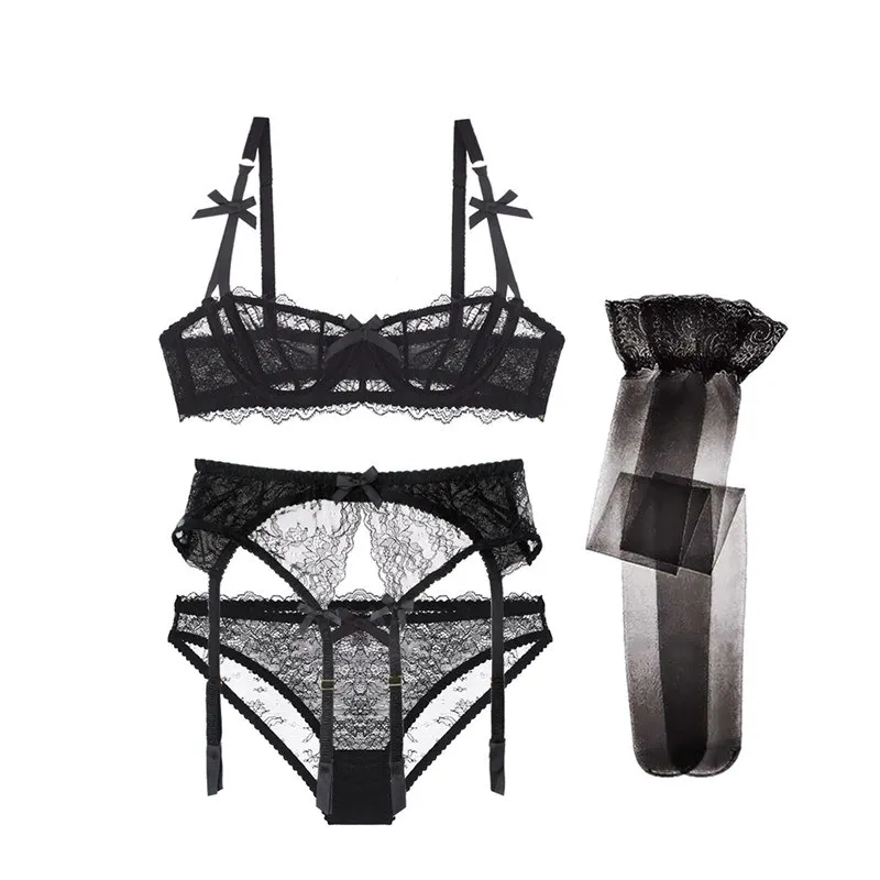Product Name: Varsbaby sexy koronki przezroczysty bez podszewki biustonosz half cup zestawy biustonosz + figi + podwiązki + pończochy 4 sztuk