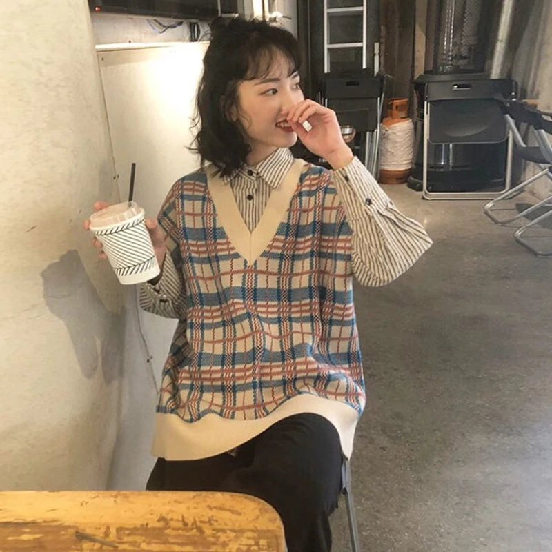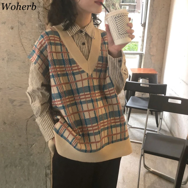 Special Offer Woherb 2020 jesień Vintage Plaid sweter kamizelka kobiety bez rękawów, dekolt v dzianiny kamizelka kobiet dorywczo Harajuku koreańskie ubrania Discount 13% Today!
