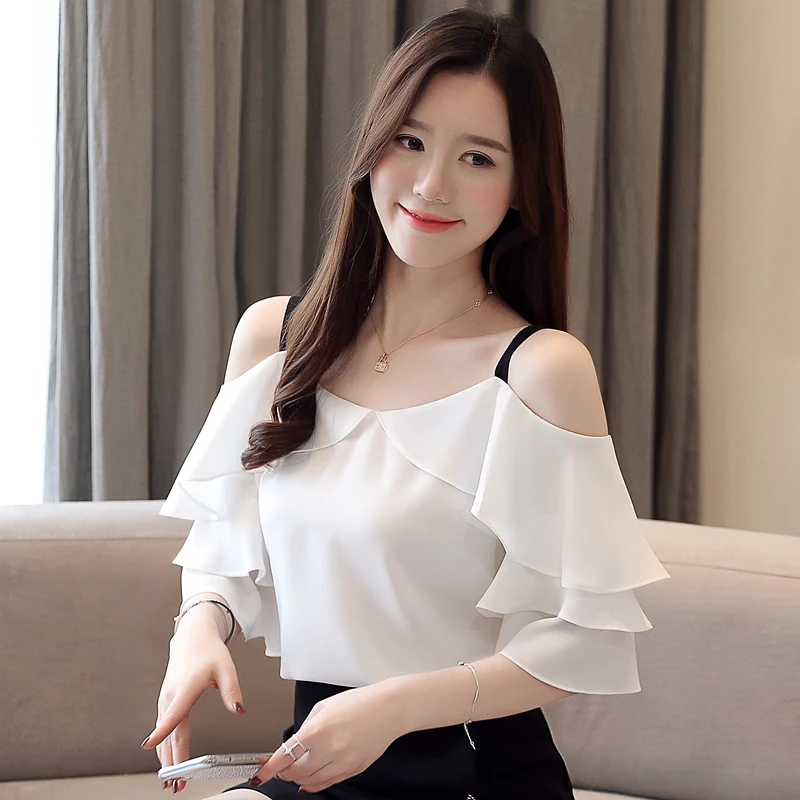 Special Offer Fashion woman bluzki 2019 koszule damskie z krótkim rękawem biała szyfonowa bluzka koszula damska bluzki z szerokim dekoltem, bez ramienia top 3571 50 Discount 33% Today!