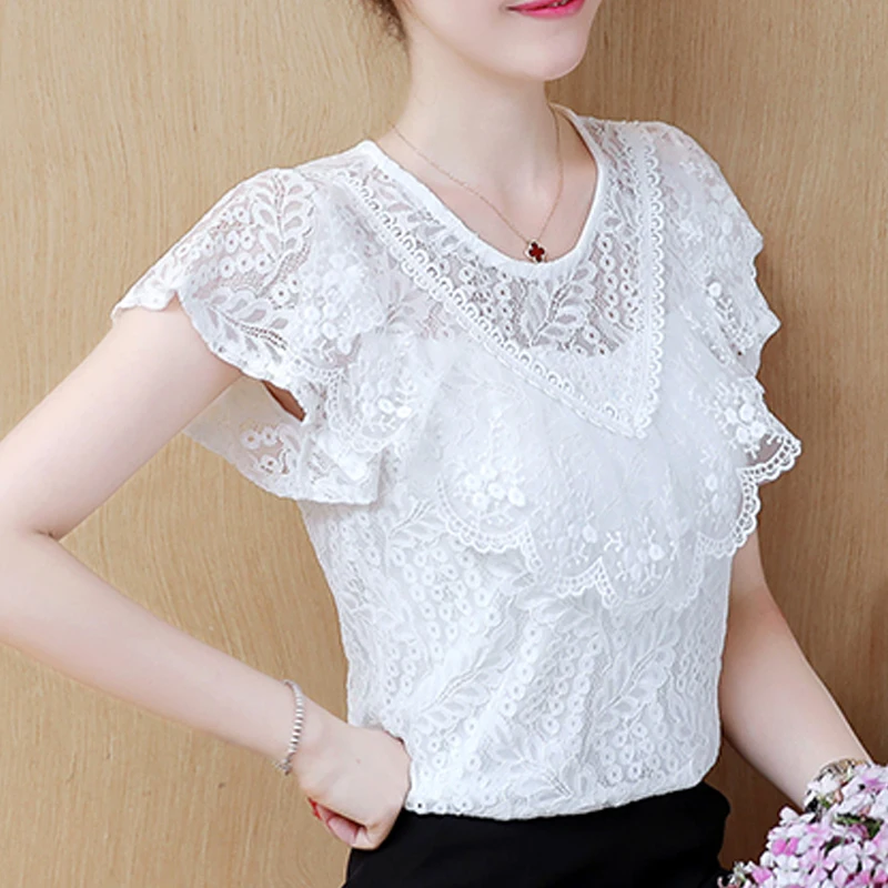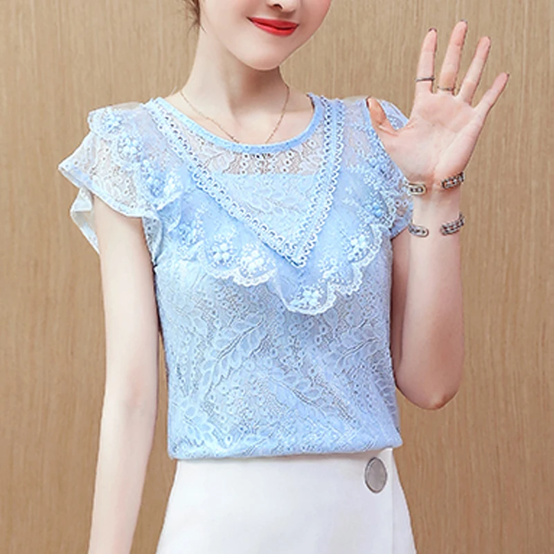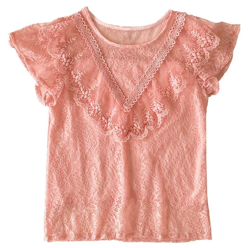 Special Offer Wzburzyć koronki z krótkim rękawem odzież damska darmowa wysyłka lato szyfonowa bluzka 2020 nowe bluzki koszule różowa koronka kobiet topy 270B Discount 32% Today!