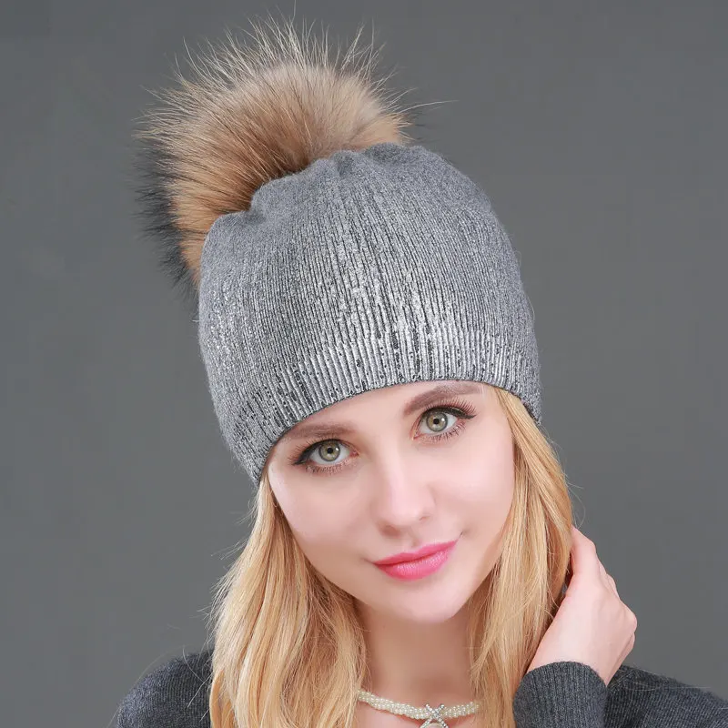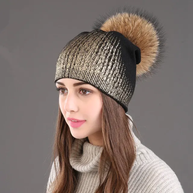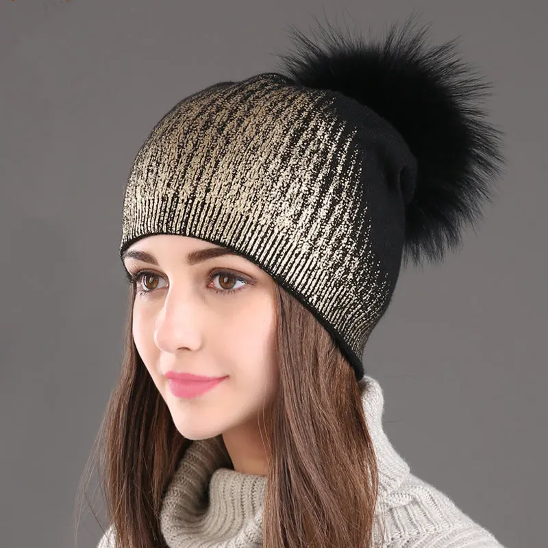 Special Offer 2019 zimowych kobiet czapka wełniana kapelusz na co dzień metaliczny kolor drukowanie z dzianiny kaszmirowy luźna czapka beanie z pompon z futra szopa kulki Discount 49% Today!